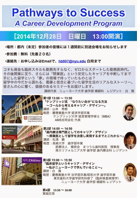 山本氏には、ビジネスの視点から、ケンブリッジ流キャリアの構築方法について、Dr.松浦からは留学を決意し、実現するまでのプロセスと、現在在籍している南カリフォルニア大学歯学部歯内療法科レジデンシープログラムの様子について講演頂く予定です。私自身も講演を通じ、留学前と留学後の心境の変化や、補綴科大学院での多岐に渡る学びをシェアするだけでなく、歯科医師としてのキャリア・デザインについても触れる予定です。